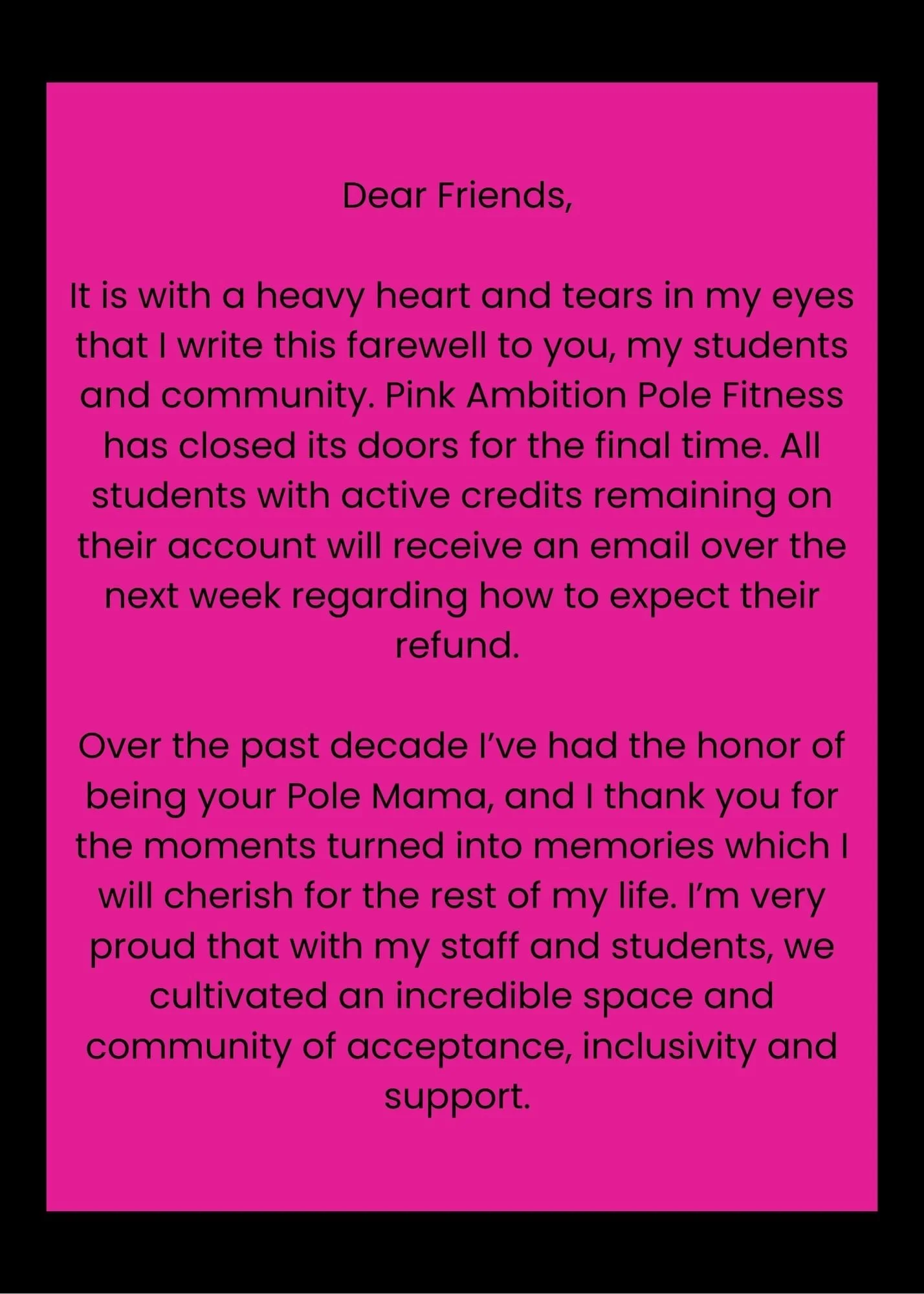 Pink Ambition Pole Fitness is a woman-owned and operated business located in downtown Harrisonburg, Virginia. We are happy to welcome all individuals age 18 and above to a safe space to get fit and explore the mind-body connection through pole fitness and dance. We offer group classes as well as private lessons and private parties for any occasion! Pink Ambition strives to promote self-love and personal growth in our students and staff.